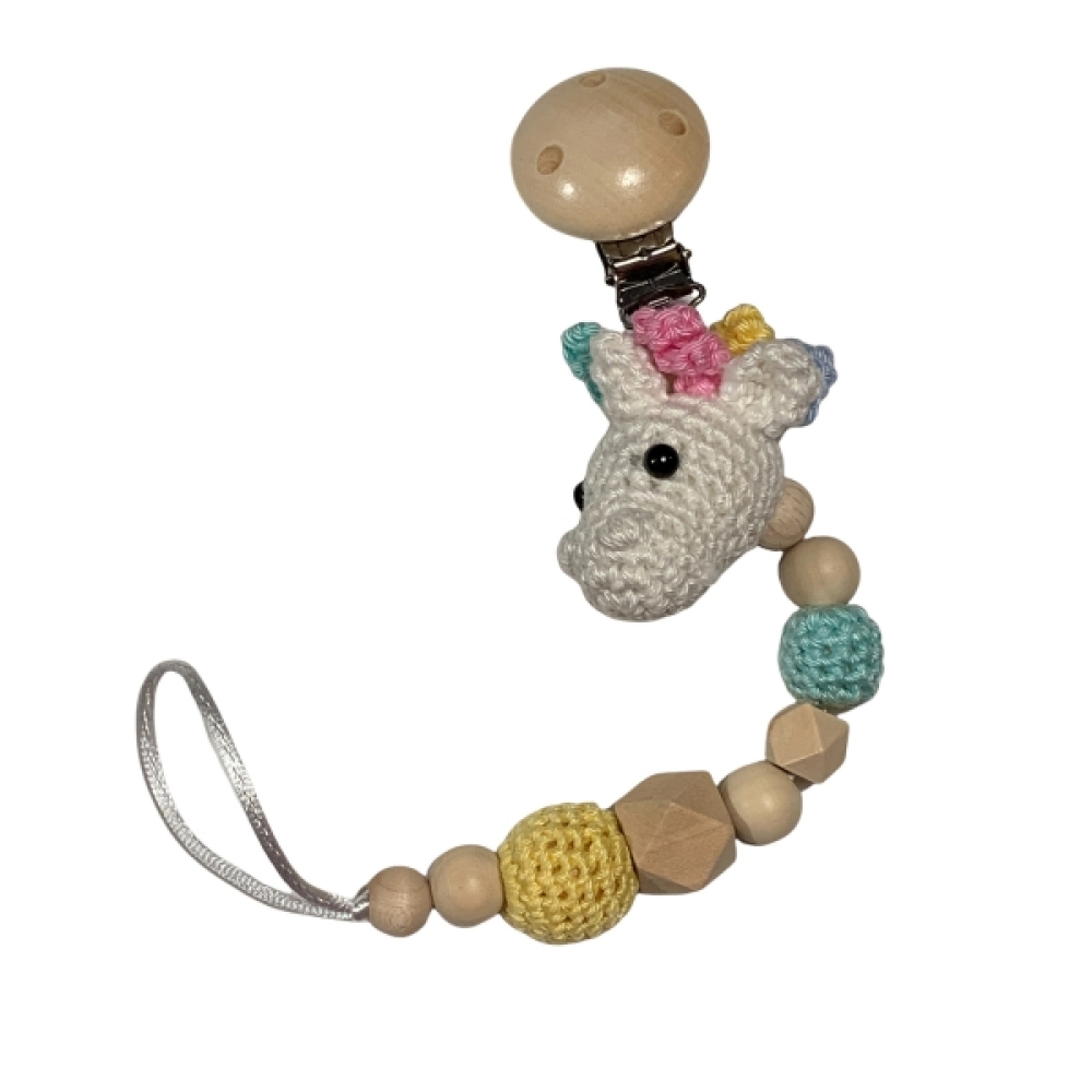 De eenhoorn heb ik gehaakt van 100% katoen net als de kralen verder heb ik houten kralen gebruikt.