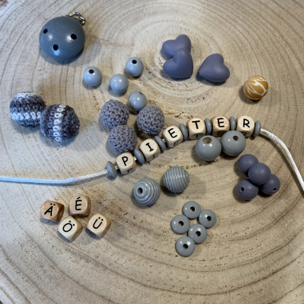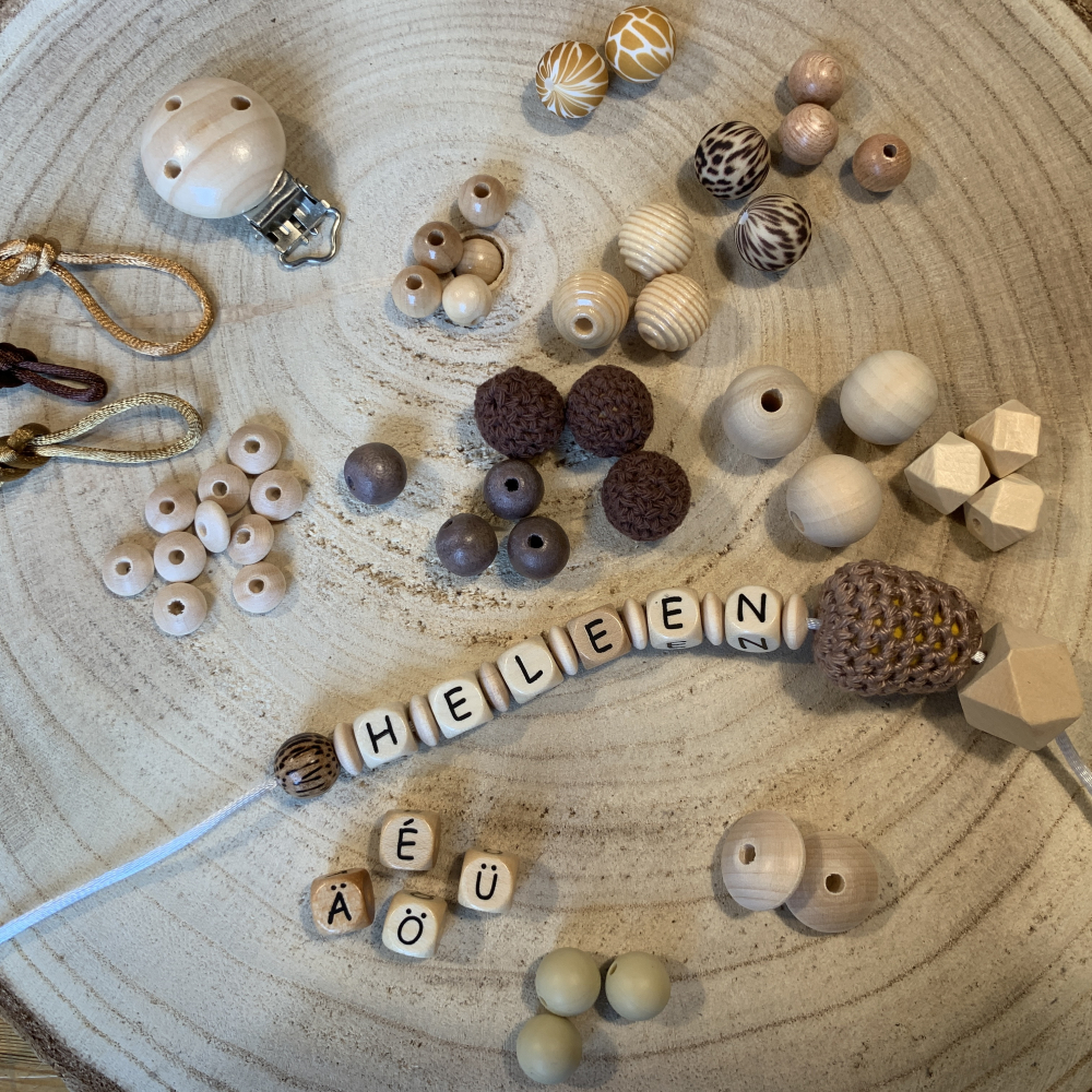 Je kunt kiezen uit houten kralen, of een combinatie van hout en siliconen kralen en of met omgehaakte kralen.