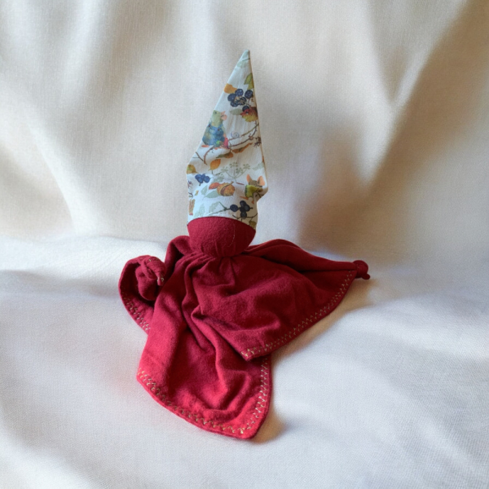De knuffel is handgemaakt van 100% katoenen flanel, flanel is een stof welke is opgeruwd aan beide kanten waardoor het heerlijk zacht aanvoelt. Het hoofdje is gevuld met schoongewassen schapenwol die heel snel de lucht van de omgeving aanneemt. Leg het popje in je bed voor een paar nachten dan ruikt het naar jou en is het voor je kindje een heel vertrouwde geur wat rust geeft bij het slapen gaan. De geknoopte handjes zijn uitnodigend om te grijpen en vast te houden of heerlijk mee te friemelen.