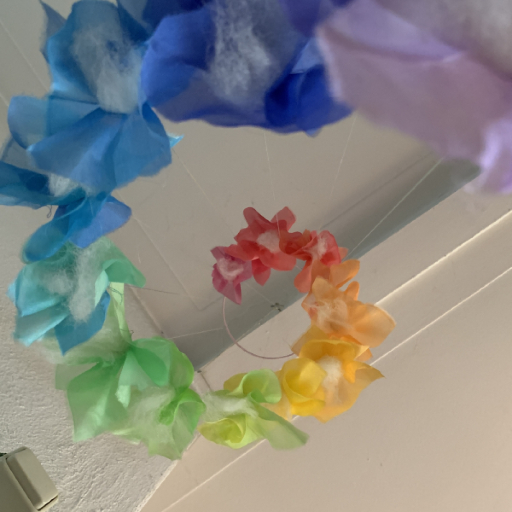 Handgeschilderde zijde regenboogmobiel. Een heerlijk zelf maak pakket en niet moeilijk om te maken. De kleuren lopen prachtig over omdat de zijde aan een stuk is geschilderd, en pas daarna in kleine lapjes voor het mobiel zijn verwerkt. Een prachtig kraamkado. Lengte van ring tot onderste elfje 117 cm, totale lengte ongeveer 147 cm. Het mobiel beweegt bij de minste lucht beweging, wat kinderen heerlijk vinden om waar te nemen.