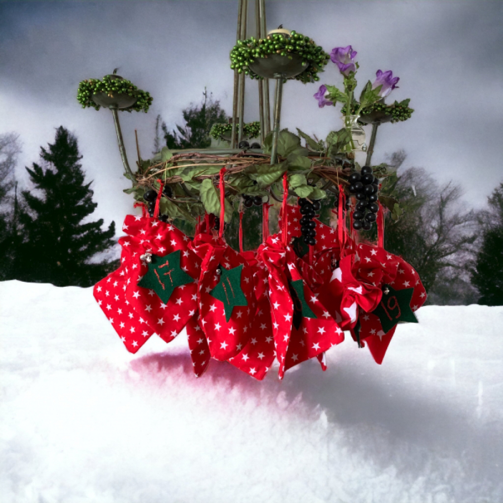 Adventzakjes, voor iedere adventsdag een zakje, daarin kun je voor iedere dag iets anders instoppen, wat de kinderen eruit kunnen halen. Leuk om aan een krans van takken te hangen, of aan een slinger. Foto 1 zitten in deze verpakking met witte sterren van schors.
