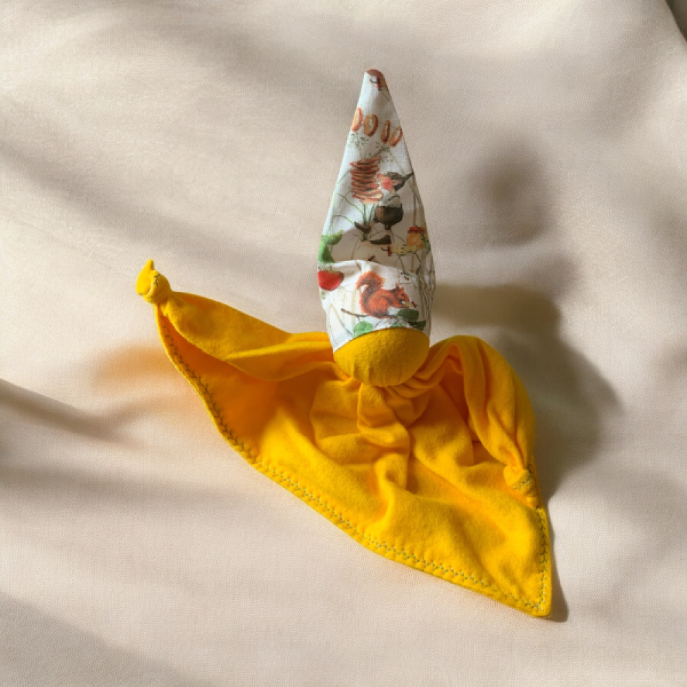 De knuffel is handgemaakt van 100% katoenen flanel, flanel is een stof welke is opgeruwd aan beide kanten waardoor het heerlijk zacht aanvoelt. Het hoofdje is gevuld met schoongewassen schapenwol die heel snel de lucht van de omgeving aanneemt. Leg het popje in je bed voor een paar nachten dan ruikt het naar jou en is het voor je kindje een heel vertrouwde geur wat rust geeft bij het slapen gaan. De geknoopte handjes zijn uitnodigend om te grijpen en vast te houden of heerlijk mee te friemelen.
