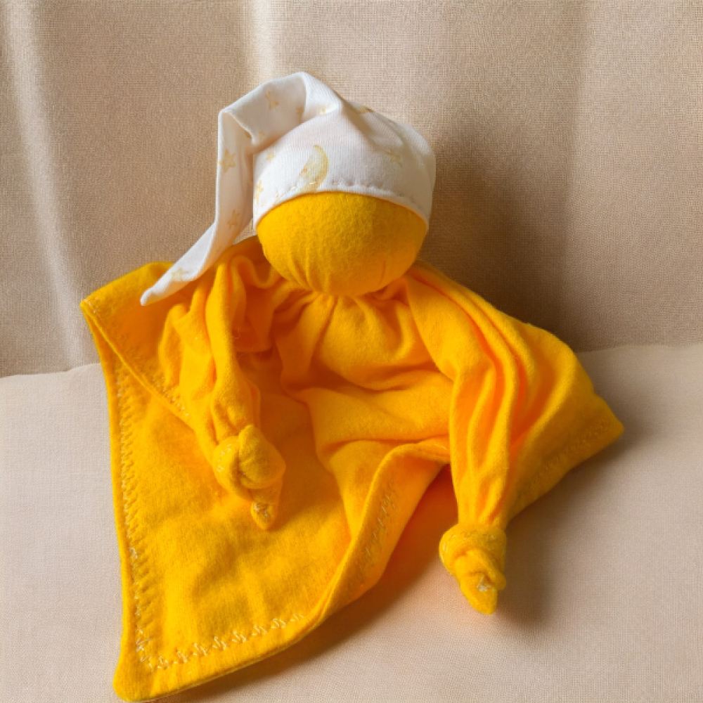 De knuffel is handgemaakt van 100% katoenen flanel, flanel is een stof welke is opgeruwd aan beide kanten waardoor het heerlijk zacht aanvoelt. Het hoofdje is gevuld met schoongewassen schapenwol die heel snel de lucht van de omgeving aanneemt. Leg het popje in je bed voor een paar nachten dan ruikt het naar jou en is het voor je kindje een heel vertrouwde geur wat rust geeft bij het slapen gaan. De geknoopte handjes zijn uitnodigend om te grijpen en vast te houden of heerlijk mee te friemelen.