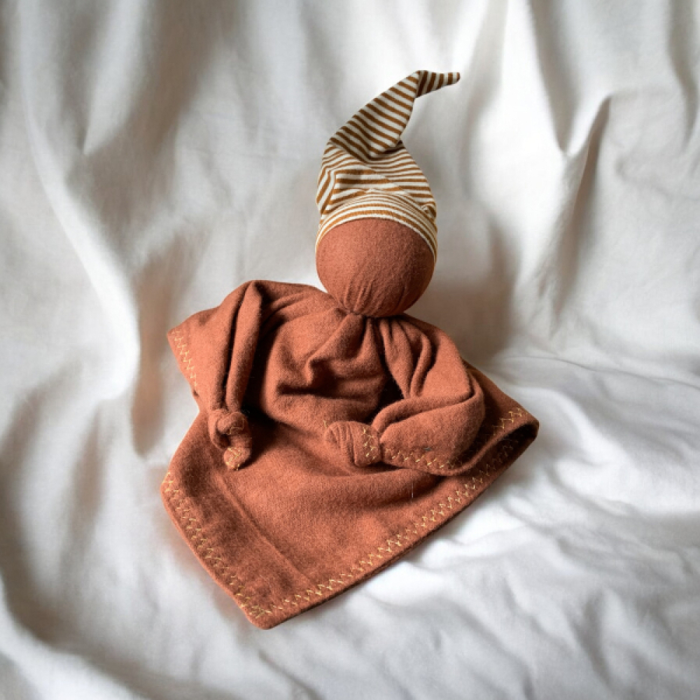 De knuffel is handgemaakt van 100% katoenen flanel, flanel is een stof welke is opgeruwd aan beide kanten waardoor het heerlijk zacht aanvoelt. Het hoofdje is gevuld met schoongewassen schapenwol die heel snel de lucht van de omgeving aanneemt. Leg het popje in je bed voor een paar nachten dan ruikt het naar jou en is het voor je kindje een heel vertrouwde geur wat rust geeft bij het slapen gaan. De geknoopte handjes zijn uitnodigend om te grijpen en vast te houden of heerlijk mee te friemelen.