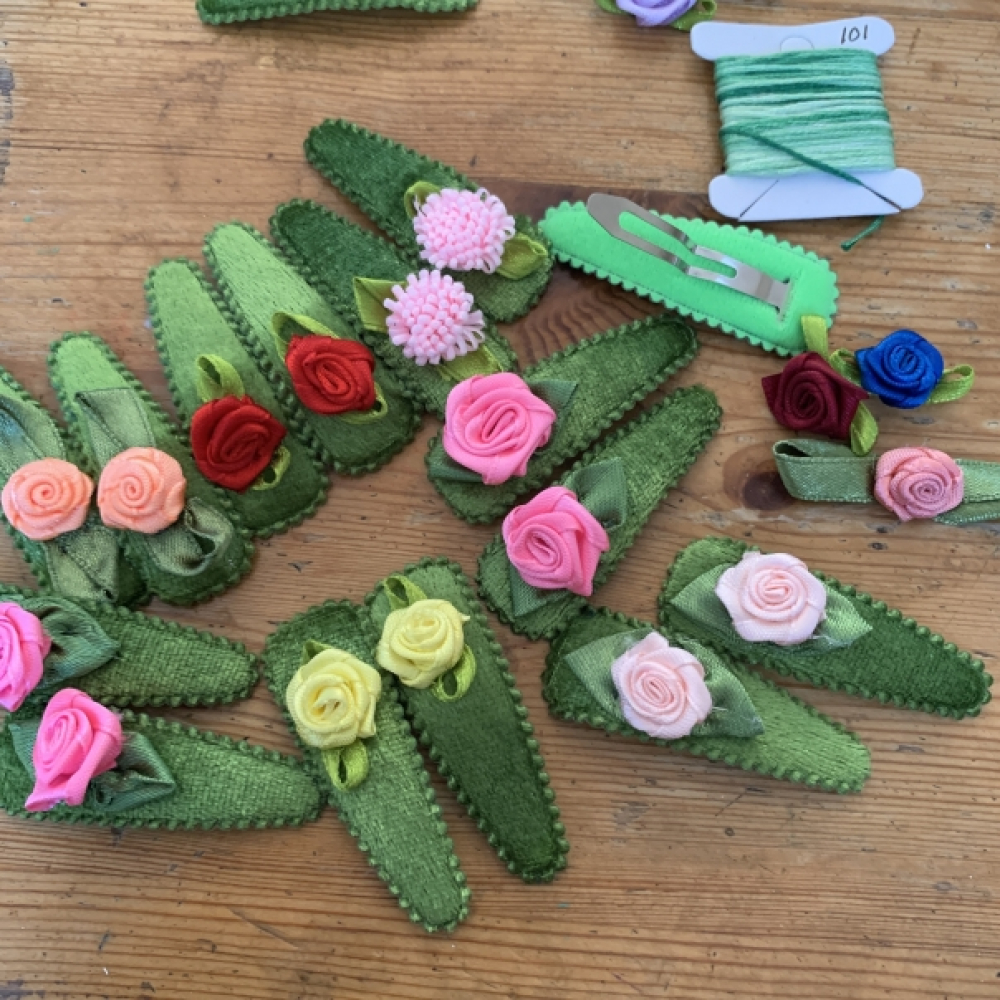 Vrolijke haarclipjes voor haartjes die altijd net in je ogen kriebelen als je iets goed wil bekijken, met deze clipjes blijven de haartjes goed zitten. Metalen clipjes versierd met stof en een fleurig roosje. Lengte 5.5 cm breedte 2 cm en loopt smal uit.