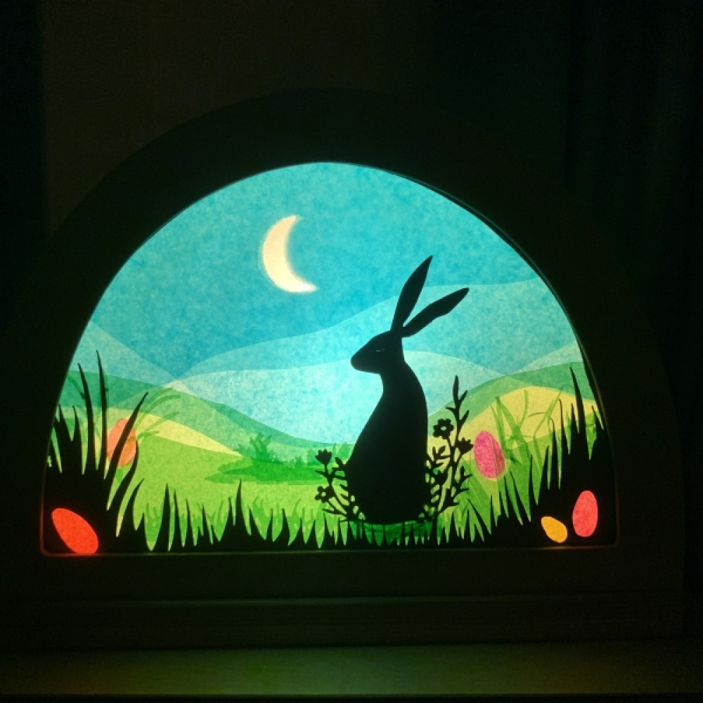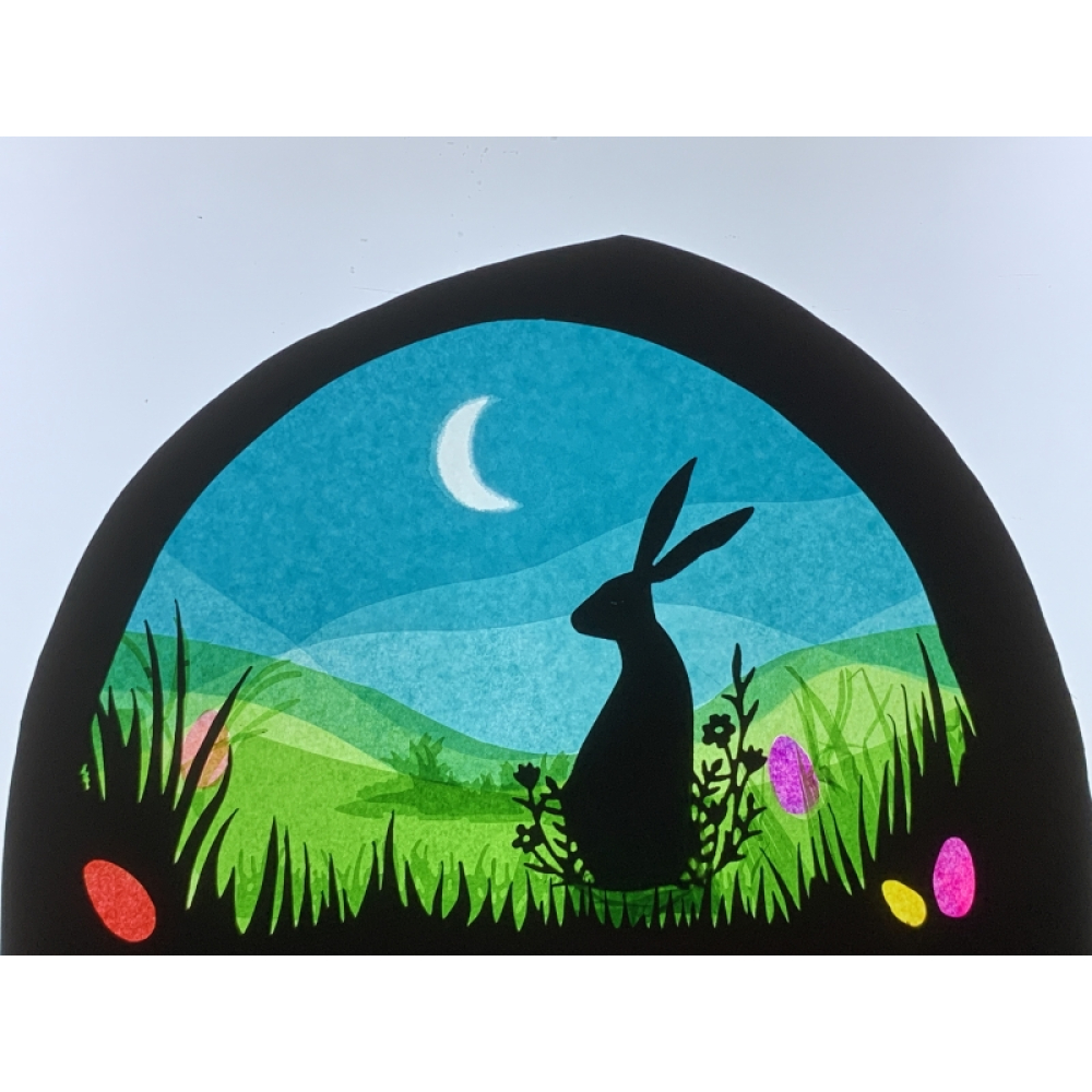 Het is Pasen, de paashaas heeft deze nacht zijn eieren verstopt, in de tuin of de hei of misschien wel ergens in het bos. Staat prachtig in een nachtlampje om bij weg te dromen. Uit bruin karton gesneden en met verschillende kleuren zijdevloeipapier de achtergrond geplakt. Afgewerkt met kalk papier een een plastic beschermlaag.